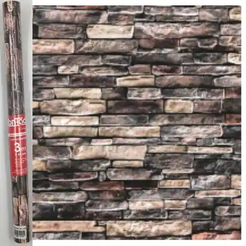El adhesivo es compatible con varias clases de superficies como tableros, cartulinas, cartones, maderas, metales entre otros. 45 cm de ancho. 3 metros de largo Su vinilo esta estampado de piedra Al Adherirlo su superficie es impermeable para cuidar del agua