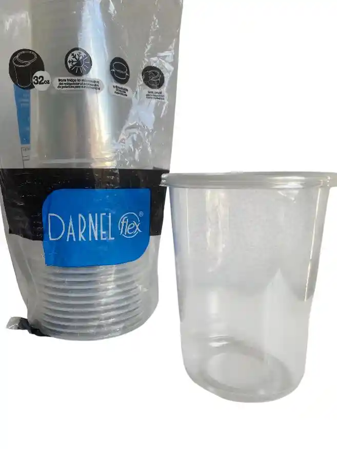 CONTENEDOR PLÁSTICO 32 ONZAS CON TAPA PAQUETES X 25 UNDS ALTURA 14.7 CMS DIÁMETRO 11.6 CMS PASA DEL REFRIGERADOR AL MICROONDAS SIN PROBLEMA NO SE ROMPE FÁCILMENTE CIERRE HERMÉTICO