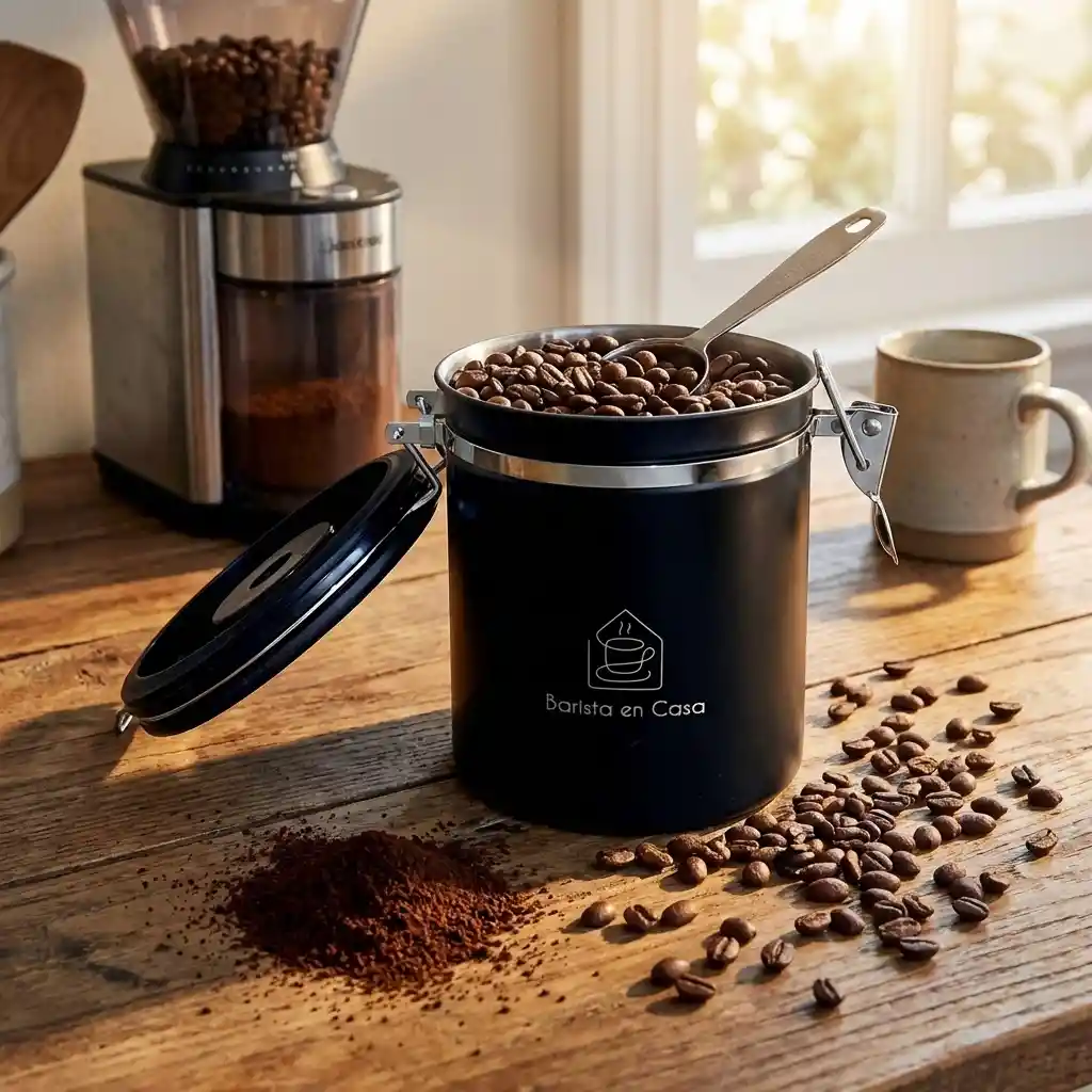 Presentamos el CONTENEDOR HERMÉTICO PARA CAFÉ, la solución ideal para conservar la frescura de tu café. Con una capacidad de 500 gramos, este contenedor de acero inoxidable ofrece un sellado hermético que preserva el sabor y aroma. Incorpora una válvula que libera los gases del café, extendiendo su frescura. Viene con una cuchara dosificadora precisa y un fijador de fecha para un control perfecto de la frescura. ¡Tu café siempre a punto con el CONTENEDOR HERMÉTICO PARA CAFÉ!