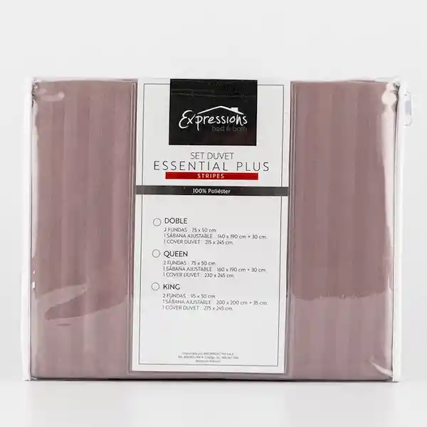 Set Duvet Stripes Tamaño Queen. 100% Poliéster. Incluye: 2 Fundas 75X50 cm. 1 Sábana Ajustable 160 x 190 + 30 cm. 1 Cover Duvet 230 x 245 cm. Color: Mauve.
