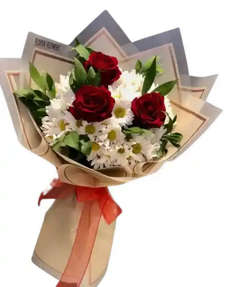 Un bouquet encantador de rosas rojas y flores blancas que combina intensidad y frescura en un diseño elegante. Flores frescas de calidad premium, seleccionadas y armadas profesionalmente para un acabado equilibrado y armonioso. Algunas flores pueden variar según la disponibilidad de temporada, manteniendo siempre la estética y el valor del arreglo. Incluye tarjeta personalizada sin costo adicional.