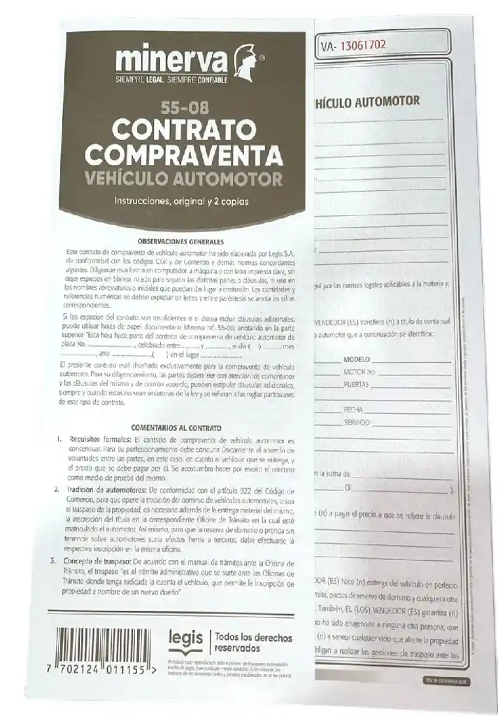 Contrato de Compraventa de Vehiculos, contiene: 1 original, 1 copia y 1 hoja borrador.