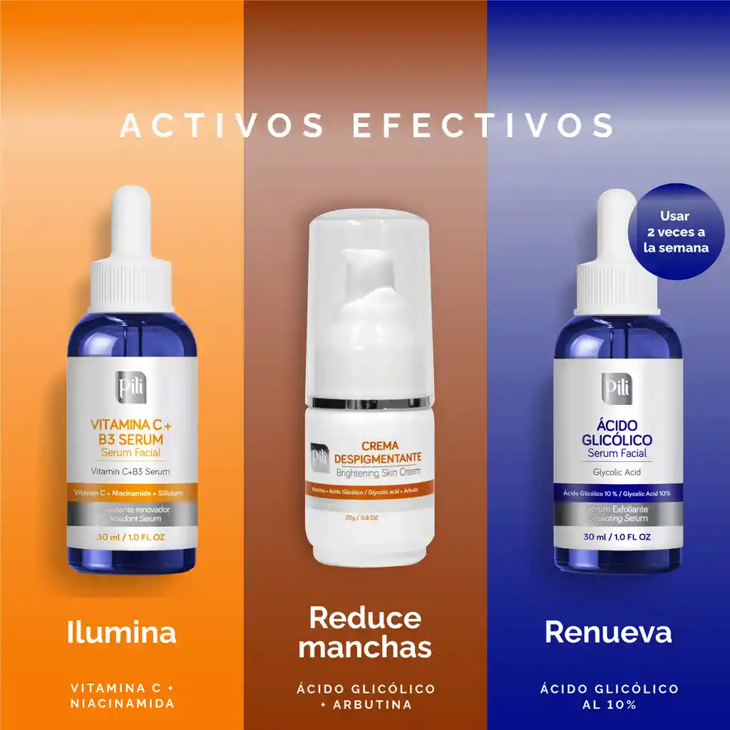 Paso Renovación: 1. Limpia tu rostro con tu jabón de rutina 2. Teniendo la piel limpia y seca, aplica una fina capa de Acido Glicólico Pili suavemente sin hacer fricción, evitando el área del contorno de los ojos ó áreas sensibles de la piel (como pliegues de nariz y comisuras de labios). Deja actuar de 3 a 10 minutos según tolerancia de la piel y retira con abundante agua. 3. Aplica crema árnica por todo el rostro masejando suavemente 4. Realiza esto dos veces a la semana, por las noches, dejando descansar la piel tres días entre cada aplicación de Acido Glicólico. Paso Rutina despigmentante: Para iniciar la rutina con la crema Despigmentante Pili, después de la renovación, deja descansar la piel una semana. 1. Limpia tu rostro con tu jabón de rutina 2. Tonifica según tu tipo de piel. 3. Aplica Crema Despigmentante Pili. Esta crema se aplica solo en la imperfección de la mancha. Durante la mañana puedes realizar tu rutina habitual de hidratación con la crema árnica, recuerda que es indispensable el uso del protector solar. El Kit Contiene Crema árnica 30g Crema Despigmentante 25gr Ácido glicólico 30 ml Recomendaciones Este kit es para uso preferencialmente nocturno. El uso de protección solar es indispensable. Si usted va a usar Acido Glicólico por primera vez, realice prueba de sensibilidad en una pequeña área de la piel antes de aplicar en el rostro. Si se presenta cualquier reacción desfavorable con la aplicación de los productos, debe suspenderse su uso.