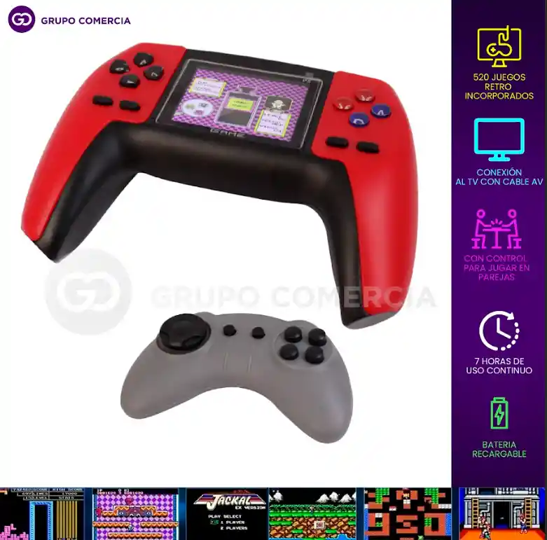 "Sumérgete en la época dorada de los videojuegos con nuestro Control Pantalla 520 Juegos Retro Portátil, una ventana al pasado con más de 520 juegos clásicos incorporados. Experimenta la emoción del multijugador conectando el dispositivo a tu TV a través del cable AV video incluido y disfruta de horas de diversión con amigos y familiares. Este versátil control no solo ofrece nostalgia sino también comodidad, con un diseño ergonómico para largas sesiones de juego. Su batería recargable proporciona hasta 7 horas de juego continuo, mientras que sus dimensiones compactas (11cm x 12,5 cm x 4cm) lo hacen fácil de transportar a cualquier lugar. Además, el control adicional para juegos multijugador (11cm x 7cm) permite una experiencia interactiva sin igual. Vive la emoción de la competición clásica y disfruta de la diversión en conjunto. Conecta, juega y revive la magia de los videojuegos retro con este dispositivo todo en uno." Esta descripción detallada resalta las características clave del producto y ofrece una visión clara de sus capacidades, promoviendo su uso individual y multijugador, la conexión a TV, la duración de la batería y las medidas tanto del dispositivo principal como del control adicional
