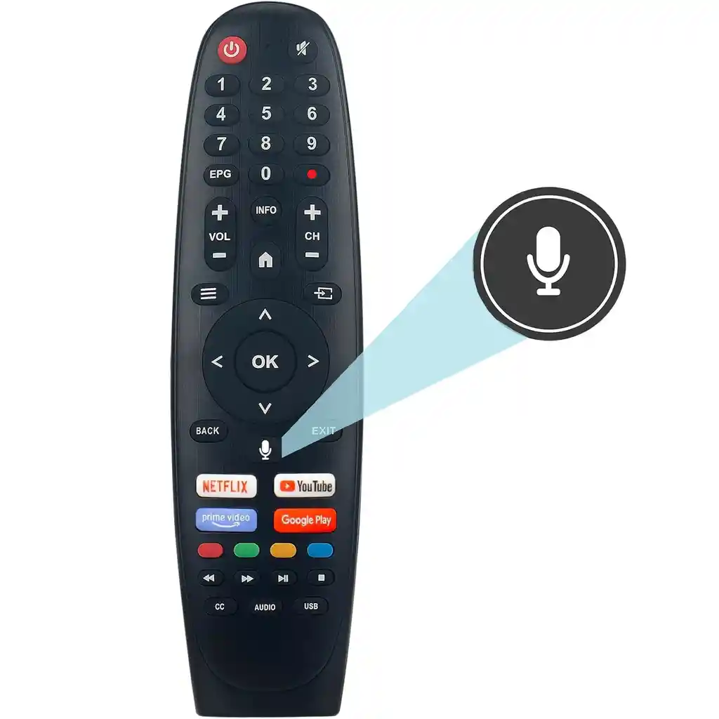 ¡El reemplazo perfecto! ¿Has perdido o dañado tu control remoto de TV CAIXUN o EXCLUSIVE? ¡No te preocupes! El Control Remoto Compatible con TV CAIXUN o EXCLUSIVE es la solución perfecta para que puedas volver a disfrutar de tus programas y películas favoritas sin interrupciones. Con su tecnología de búsqueda por voz y conectividad Bluetooth, se convertirá en tu herramienta esencial para disfrutar de películas, programas y aplicaciones favoritas. Experimenta la comodidad y la simplicidad con nuestro Control Remoto para CAIXUN o EXCLUSIVE, diseñado para ofrecerte un acceso rápido y sin complicaciones a tus aplicaciones de streaming preferidas. Con botones directos para Youtube, Netflix, Prime Video y Google Play, este control es tu pasaporte a un mundo ilimitado de entretenimiento digital. NOTA: Si tu control remoto original es igual al de las imágenes o en la publicación se menciona la compatibilidad con tu modelo, puedes comprar con la confianza de que te funcionará perfectamente. Si no es igual, por favor déjanos saber el modelo y marca del TV o control remoto, o una foto del control remoto para confirmar la compatibilidad. CARACTERÍSTICAS - Compatibilidad Total: Este control remoto genérico es compatible con tu TV CAIXUN o EXCLUSIVE con el mismo control, lo que significa que se adapta a tu dispositivo sin problemas. - Control por Voz Avanzado: Este control remoto cuenta con funciones de voz que te permiten buscar contenido, cambiar de aplicación y controlar las funciones de tu TV con comandos de voz simples y efectivos. Disfruta de un control manos libres para una experiencia más fluida. - Acceso Directo a Aplicaciones: Con botones de acceso directo, incluyendo Youtube, Netflix, Prime Video y Google Play, puedes disfrutar de tu contenido favorito con solo presionar un botón. - Configuración Sencilla: Simplemente instala dos baterías AAA (no incluidas), presiona los botones de acuerdo a las instrucciones y el control estará listo para funcionar en segundos. ESPECIFICACIONES - Compatibilidad: CAIXUN y EXCLUSIVE - Alimentación: 2 baterías AAA (no incluidas). - Conectividad: Bluetooth - Material: Plástico resistente y duradero. - Control Genérico de Alta Calidad INCLUYE 1x Control remoto para TV CAIXUN o EXCLUSIVE, según descripción VINCULACIÓN DEL CONTROL REMOTO POR VOZ 1. Enciende manualmente tu TV. 2. Coloca 2 baterías AAA a tu control remoto. 3. Ubíquese a menos de 10 cm del TV y con el control remoto apuntando directamente a TV, mantener presionada la tecla VOLUMEN ABAJO (-) y BACK del control remoto al mismo tiempo durante unos 3 a 6 segundos hasta que parpadee el LED rojo ubicado al lado del botón de Encendido. 4. El control debería emparejarse automáticamente con su dispositivo. ¡Ahora podrás usar el asistente de voz! COMPATIBILIDAD COMPATIBLE CON: C43T1UA C43V1UA C43VAUA C50V1UA C50VAUA C55V1UA C55VAUA C58T1UA C65V1UA C65VAUA C75T1UA C65V3QA C55V3QA C50V3QA E50V2UA EC40V2FA EC32V2HA C32VAHG C32VBHG C40VAFG C40VBFG C43VAFG C43VAUG C50VAUG C55VAUG C65VAUG NO COMPATIBLE CON: C43VAFG, C40VAFG, C32V1HV, C40V1FV, C43V1FV, C65VAUG, C40VAFW, CX43S1FSM, C43VAFW, C43VAFW