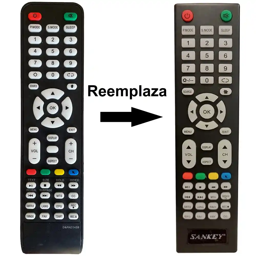 ¡El reemplazo perfecto! ¿Has perdido o dañado tu control remoto de tu TV SANKEY? ¡No te preocupes! El Control Remoto Compatible con SANKEY AD1459 es la solución perfecta para que puedas volver a disfrutar de tus programas y películas favoritas sin interrupciones. NOTA: Si tu control remoto original es igual al de las imágenes o en la publicación se menciona la compatibilidad con tu modelo, puedes comprar con la confianza de que te funcionará perfectamente. Si no es igual, por favor déjanos saber el modelo y marca del TV o control remoto, o una foto del control remoto para confirmar la compatibilidad. CARACTERÍSTICAS - Compatibilidad total: Este control remoto genérico es compatible con tu TV SANKEY con el mismo control, lo que significa que se adapta a tu dispositivo sin problemas. - Diseño Ergonómico y Fácil de Usar: Con un diseño ergonómico que se ajusta cómodamente a tu mano, este control remoto es fácil de usar, incluso durante largas sesiones de entretenimiento. - Funcionalidad Completa: Con todos los botones necesarios para navegar por tu TV, incluidos los botones de reproducción, pausa, avance rápido, retroceso y selección, este control te permite acceder a todas las funciones esenciales con facilidad. ESPECIFICACIONES - Modelo Compatible: SANKEY - Alimentación: 2 baterías AA (no incluidas). - Conectividad: IR (infrarrojo). - Material: Plástico resistente y duradero. INCLUYE 1x Control remoto para TV SANKEY AD1459