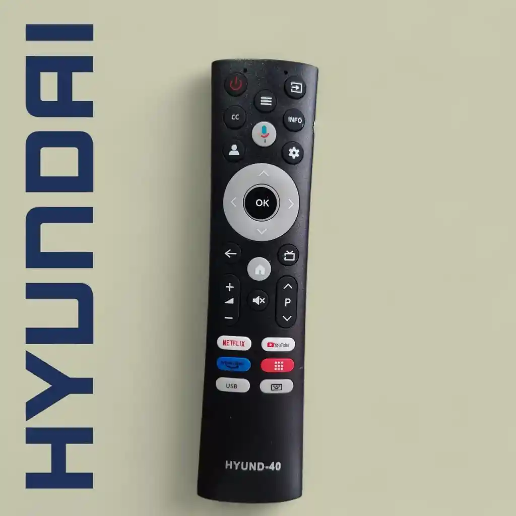 Control remoto compatible con televisores Hyundai Smart TV, modelo HYUND-40. Ofrece un funcionamiento confiable y práctico, ideal como reemplazo del control original. ✅ Compatible con televisores Hyundai Smart TV. ✅ Accesos directos a Netflix, YouTube y Prime Video. ✅ Diseño ergonómico, resistente y liviano. ✅ Excelente alcance y respuesta inmediata. ✅ No requiere configuración: listo para usar.