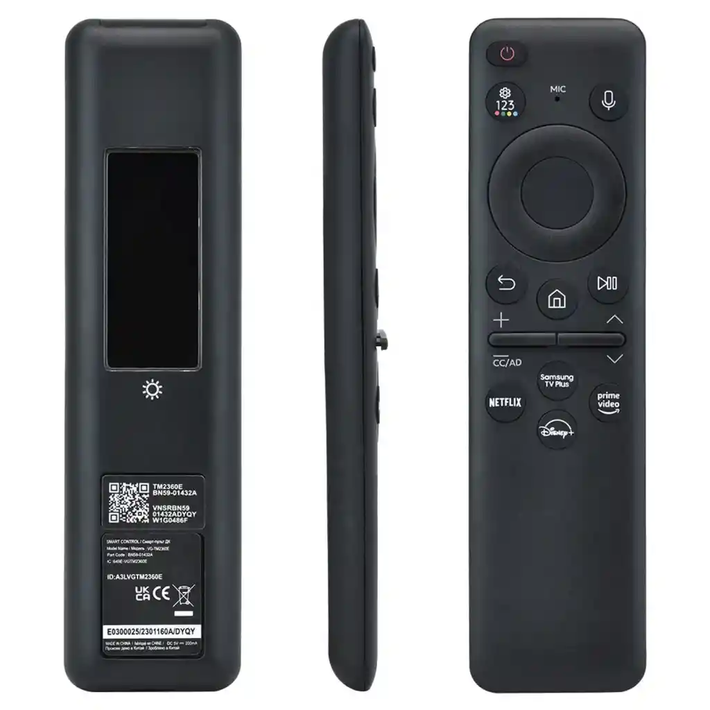 Control Remoto Samsung SolarCell 8K Potencia tu entretenimiento con este control remoto ecológico y avanzado, diseñado específicamente para televisores Samsung 8K. Carga Solar y USB-C: Olvídate de las pilas; se carga con la luz interior o mediante cable. Comando de Voz: Navega por apps y menús solo con tu voz. Diseño Mini y Ergonómico: Compacto, ligero y fácil de usar. Compatibilidad Total: Acceso directo a Netflix, Disney+ y Prime Video.