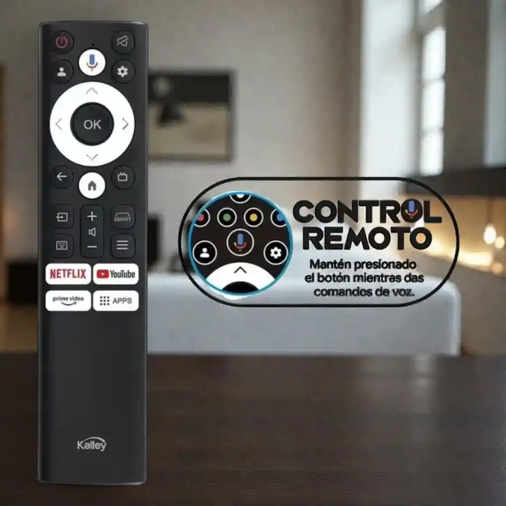 Disfruta una experiencia Smart TV más rápida y cómoda con este control remoto Kalley con comando de voz, diseñado para un manejo intuitivo y eficiente. Permite buscar contenidos, abrir aplicaciones y navegar por el menú usando tu voz, simplemente manteniendo presionado el botón de micrófono. Cuenta con accesos directos a Netflix, YouTube, Prime Video y Apps, facilitando el acceso inmediato a tus plataformas favoritas. Su diseño ergonómico y botones bien distribuidos garantizan un uso cómodo y preciso. Características principales: Función de control por voz integrada Botones dedicados para plataformas de streaming Navegación Smart TV rápida e intuitiva Diseño moderno, ligero y resistente Ideal como reemplazo o control adicional Fácil sincronización con televisores Kalley compatibles Perfecto para quienes buscan comodidad, tecnología y control total desde un solo dispositivo.