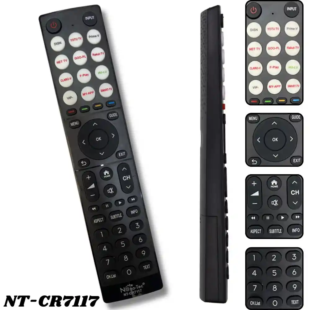Control Remoto Universal Para Smart Tv Nanotec Cr7117 Recupera el control total de tu entretenimiento con el Mando Universal Nano-Tec NT-CR7117. Diseñado específicamente para televisores inteligentes modernos, este control remoto no solo cubre las funciones básicas de cambio de canal y volumen, sino que está equipado con una impresionante botonera de accesos directos a plataformas de streaming, facilitando la navegación por tus aplicaciones favoritas sin necesidad de entrar a menús complicados. Características Principales: - Botones de Acceso Directo: Cuenta con teclas dedicadas en la parte superior para ingresar rápidamente a servicios populares de Streaming. - Control Total de Funciones: Incluye teclado numérico completo (0-9), control de volumen y canales (Vol/CH), botón de silencio (Mute), y mucho más. Especificaciones: Marca: Nano-Tec. Modelo: NT-CR7117. Tipo: Universal para Smart TV. Alimentación: Baterías 2x AAA (No incluidas).
