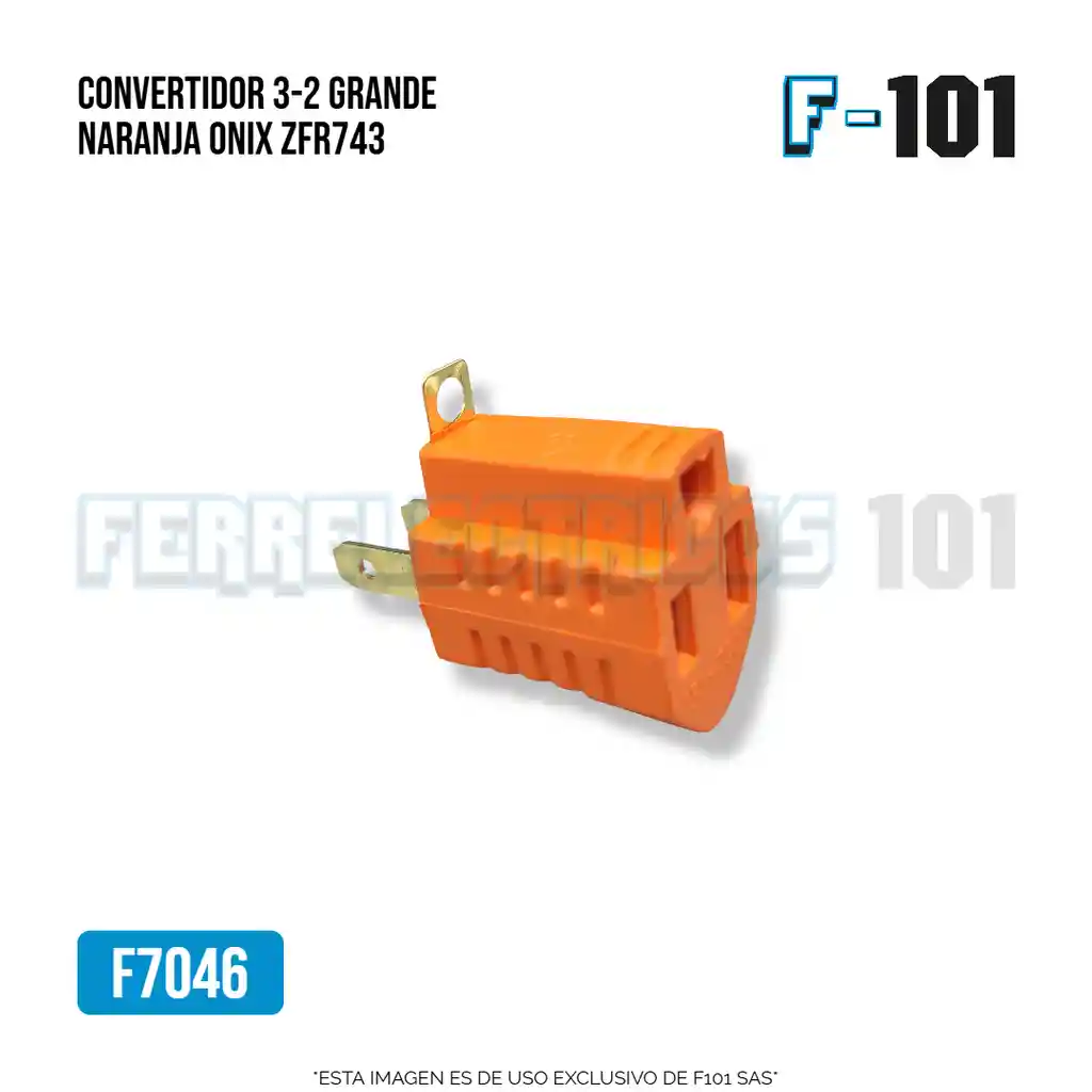 Adaptador eléctrico de tres a dos entradas, color naranja. Permite conectar equipos de clavija polarizada en tomas convencionales. Compacto, resistente y seguro, ideal para uso en el hogar, oficina o taller.