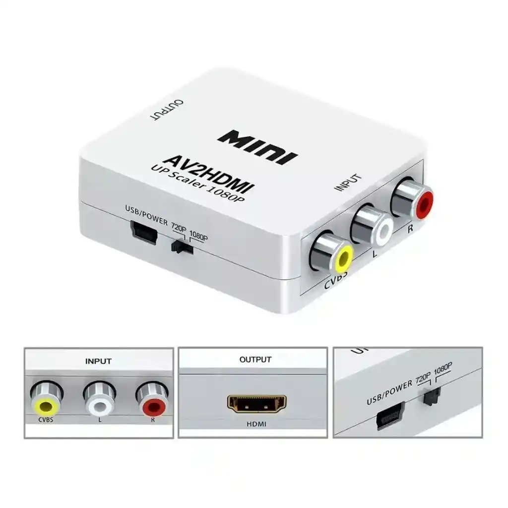 - Referencia AV2HDMI -Funcion: Convertidor - Entrada: RCA (Amarillo/Blanco/Rojo) - Salida: HDMI v1.3 - Formato A/V de entrada: PAL 576i o NTSC 480i seleccionable - Formato HDMI de salida: 720p@60Hz / 1080p@60Hz - Material: plástico ABS