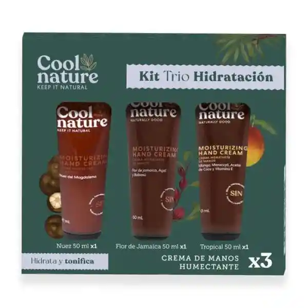 Set Cool Nature Contiene 3 Unidades de 50 mL c/u. Desarrolladas Para Pieles Extra Secas. Ayudan a Reducir la Pérdida de Agua Aumentando su Nivel de Hidratación y Dejándola Suave al Tacto. su Exclusiva Fórmula es Libre de Sulfatos y Parabenos. Estas Cremas Retienen la Humedad en la Capa Epidérmica Devolviéndole a la Piel su Elasticidad e Hidratación Mientras Previene la Resequedad. Estas Cremas Para Manos Cuentan Con Una Textura Cremosa Que se Absorbe Rápidamente y Repara la Piel.