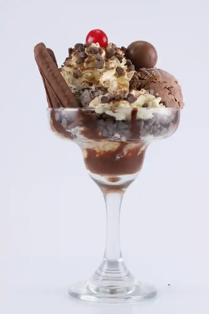 Dos sabores de helado acompañados de chantilly, salsa de chocolate, chips de chocolate, burbuja y deditos de chocolate.