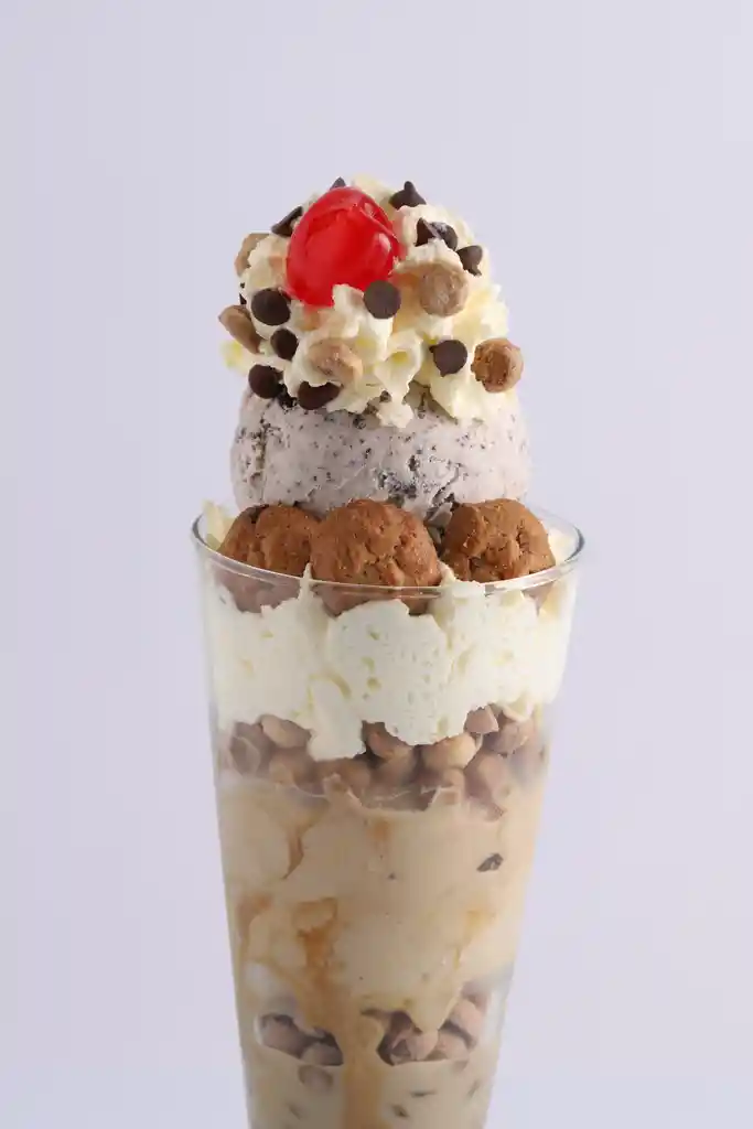 Dos sabores de helado acompañados de crema de ron, galleta mini chips, chantilly, chisp de chocolate y salsa.