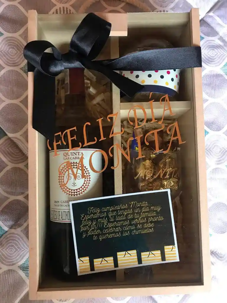 Caja de madera y tapa de vidrio decorada, vino botella Quinta las Cabras, Copa vidrio, dos burbujas chocolate, Snack de chomelos