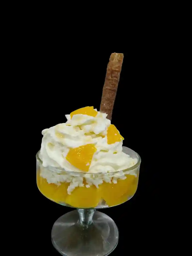 DOS BOLAS DE HELADO ACOMPAÑADO DE TROZOS DE DURAZNO, QUESO RAYADO, CHANTILLY Y LECHE CONDENSADA.