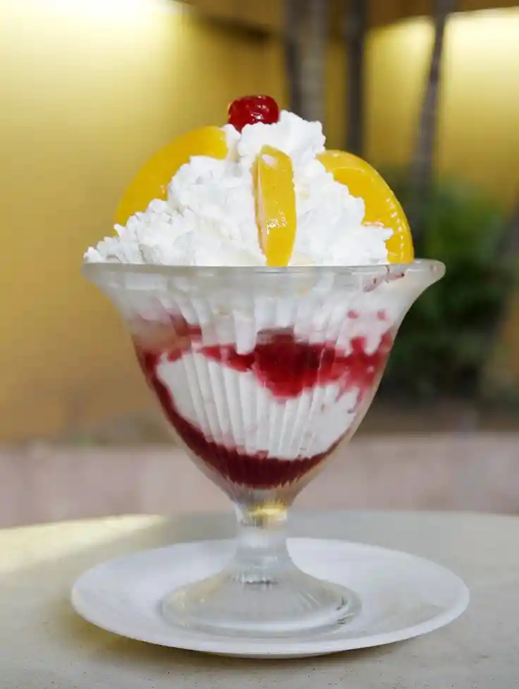 disfruta dos porciones de helado entre duraznos y trozos de brownie, acompañado de crema chantilly. salsa de su elección