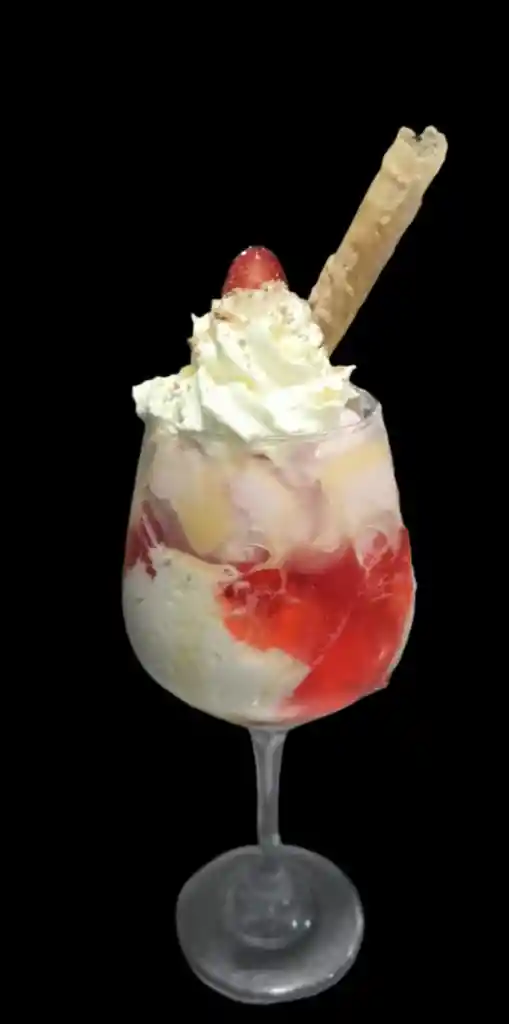 DOS BOLAS DE HELADO ACOMPAÑADAS DE GELATINA , CREMA DE CHANTILLY Y LECHE CONDENSADA.