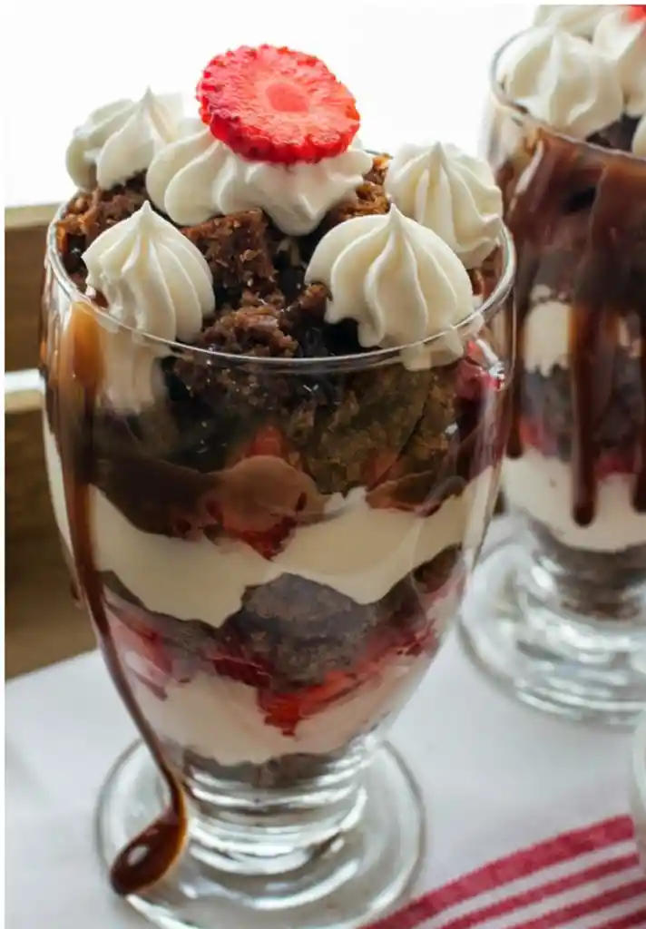 Dos porciones de helado, Trozos de brownie, queso, fresas, chips de chocolate, cereza, barquillo y salsa.