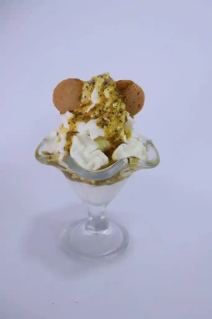 dos sabores de helado, acompañados con salsa de maracuyá de la casa, durazno, crema chantilly y dos galletas de mantequilla.