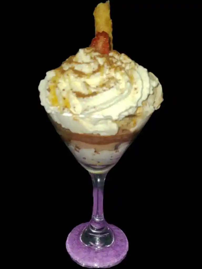 DOS BOLAS DE HELADO ACOMPAÑADAS DE MILO , CREMA CHANTILLY Y LECHE CONDENSADA.