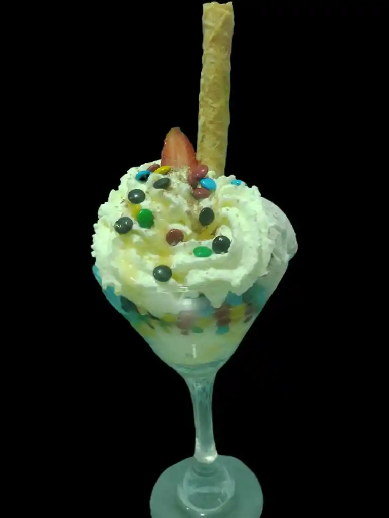 DOS BOLAS DE HELADO ACOMPAÑADAS DE MM ,CREMA CHANTILLY Y LECHE CONDENSADA.