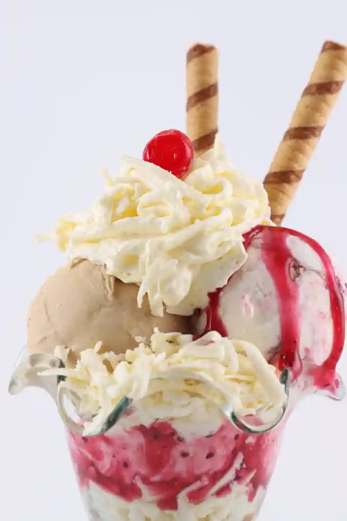Dos sabores de helado, acompañados con queso, salsa, chantilly y barquillo
