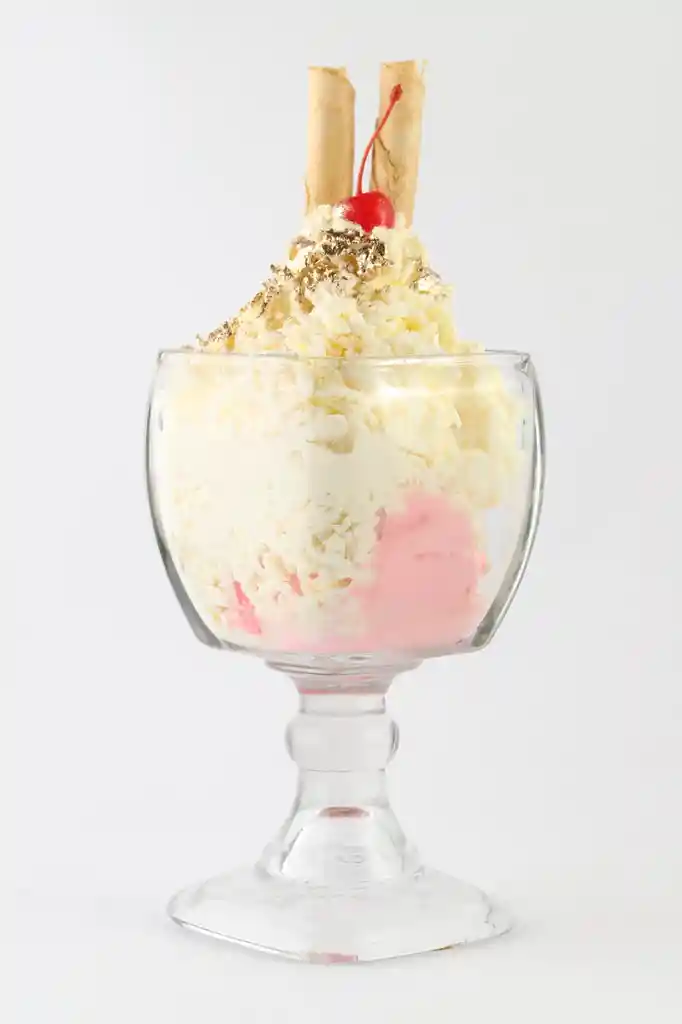 Tres sabores de helado a tu gusto, acompañado de queso, crema de leche, chantilly, cereza y barquillo
