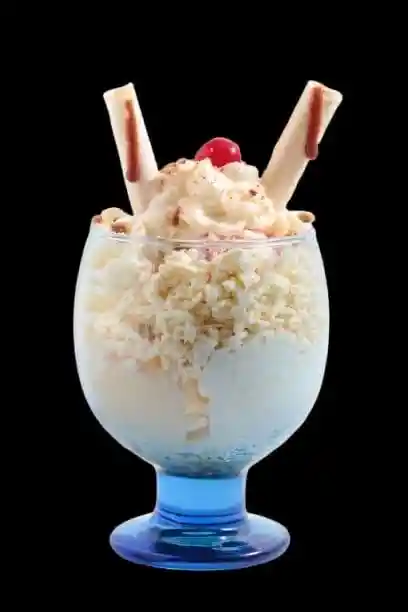 Tres sabores de helado, queso, chantilly, cereza, barquillo y salsa.