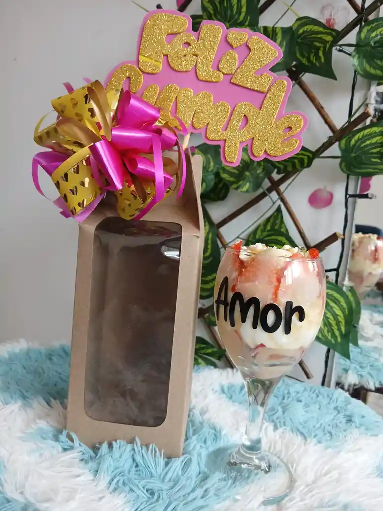 Copa de cristal con fresas con crema y queso, decorada con vinilo en la copa (feliz cumple, feliz día, te amo, te quiero o con cariño para ti), moño y topper (feliz cumpleaños o feliz dia)