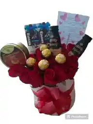 cajita redonda con rosas+ 2 bayles mini+ dulces raspberry y peaches +2 chocolates kisses +5 ferreros + tarjeta con mensaje personalizado