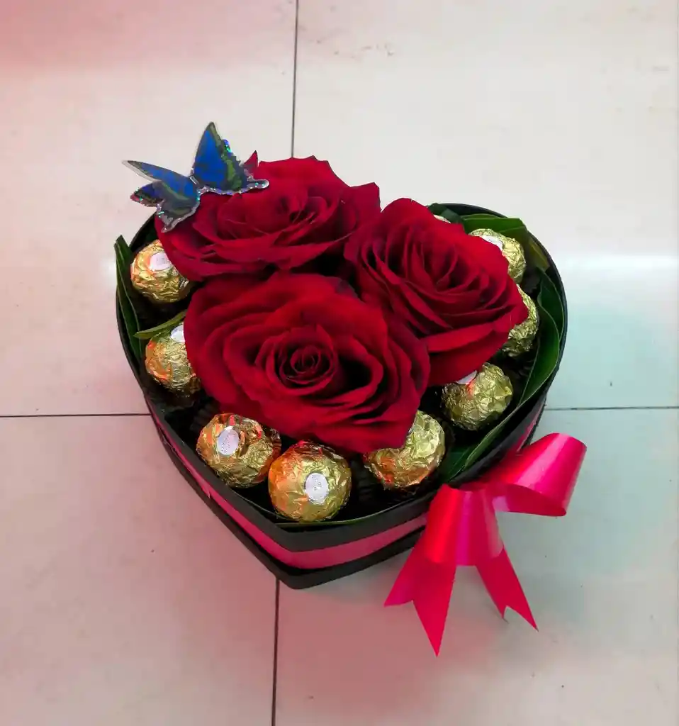 Hermoso corazon x 3 rosas + 8 chocolates + mariposa + tarjeta del motivo