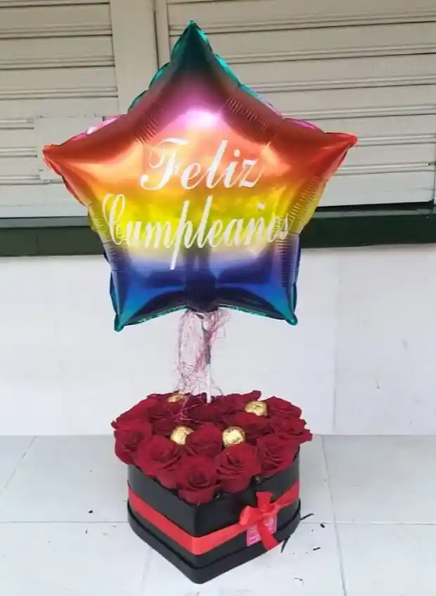 Corazón x 24 rosas + 4 chocolates + globo del motivo + tarjeta mensaje