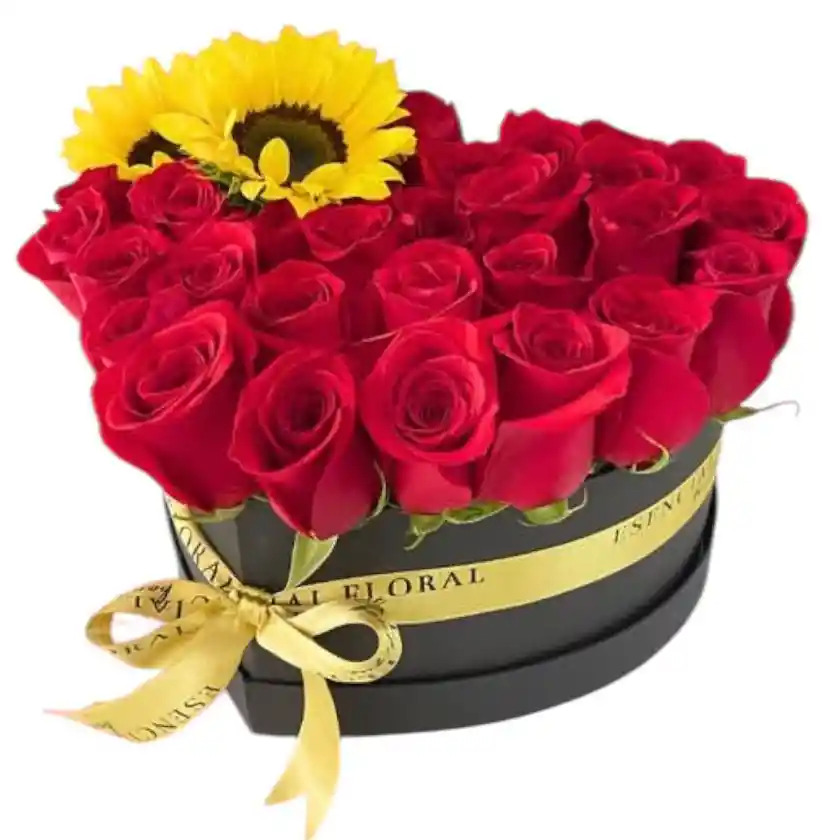 CAJA DE CORAZON CON ROSAS Y GIRASOL CON SINTA Y MOÑO TARJETA PERSONALIZADA