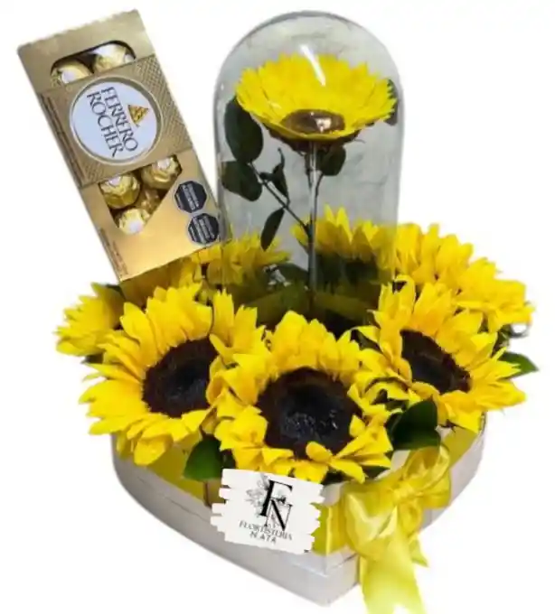 ARREGLO EN CAJA DE CORAZON CON GIRASOLES , UN GIRASOL PRECERVADO EL CUAL DURA DE 3 A 5 AÑOS , CHOCOLATES FERRERO ROCHER X 8 , MOÑO,TARJETA PERSONALIZADA