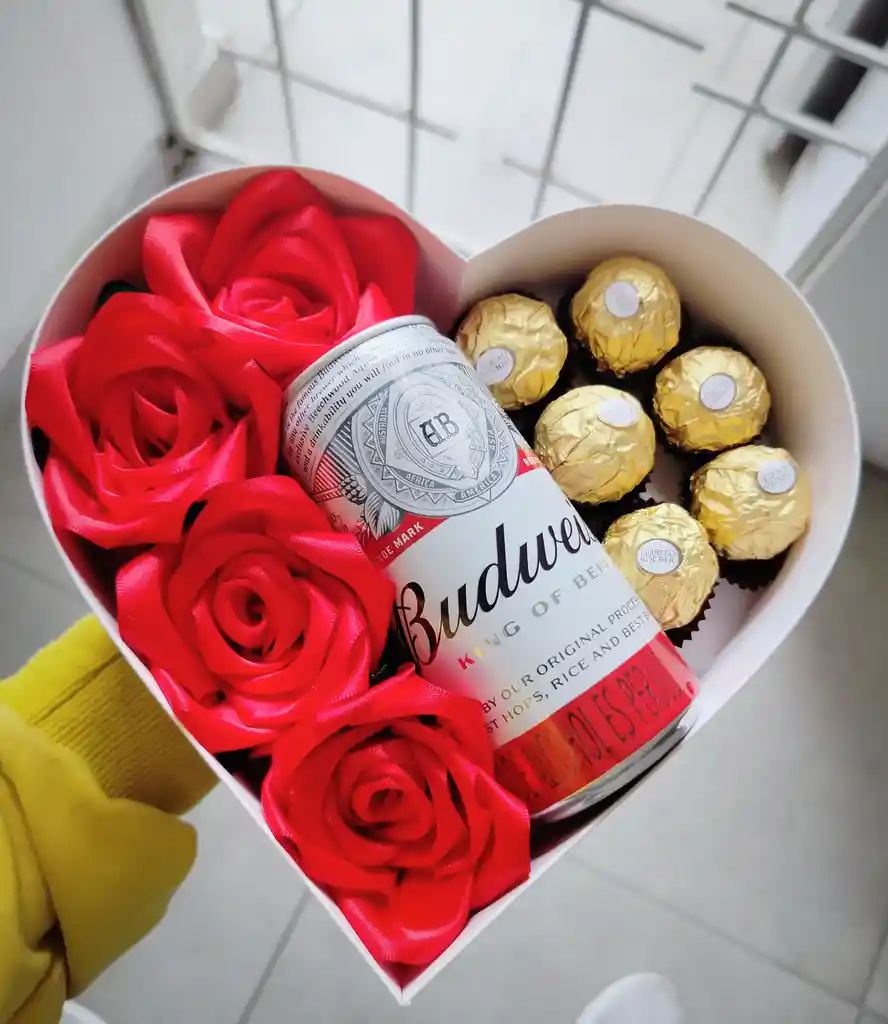 Corazón blanco con bombones de chocolate más rosas preservadas más cerveza