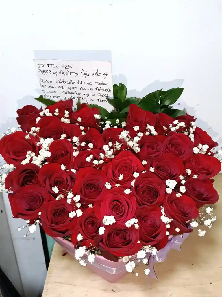 CAJA EN FORMA DE CORAZON CON ROSAS A SU GUSTO Y CANTIDAD SI LO REUIERES CON CHOCOLATES