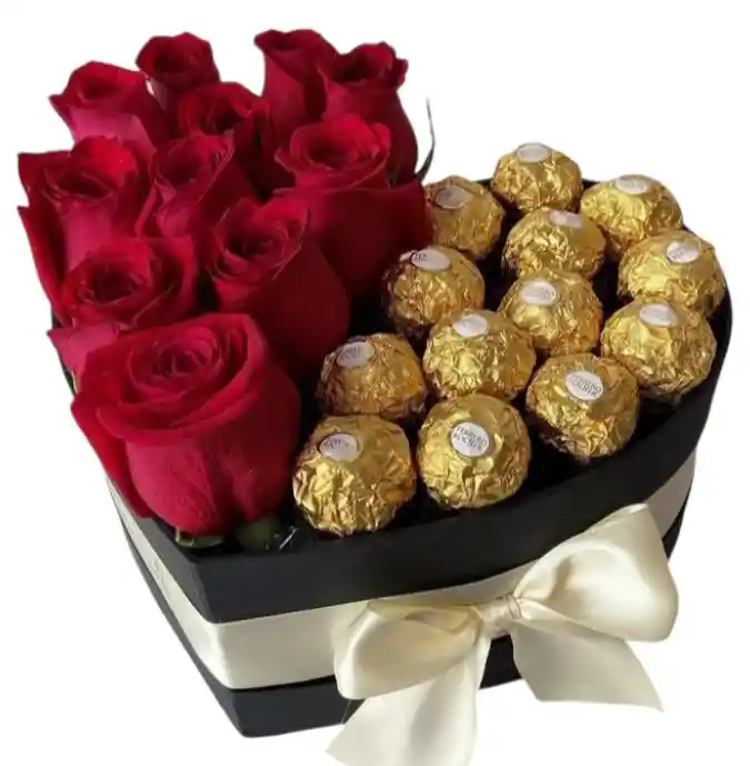 CORAZON CON 12 ROSAS ROJAS , CHOCOLATER FERRERO ROCHER , CAJA NEGRA , MOÑO , TERJETA PERSONALIZADA