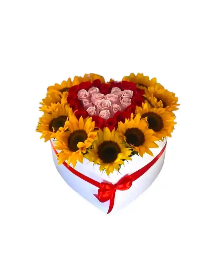 Corazón de 24 rosas y girasoles. SI DESEA ALGUNA NOTA PARA LAS FLORES DEJARLO EN DEJAR UN COMENTARIO EN AL SHOPPER, MENSAJE CORTO (TARJETA PEQUEÑA).