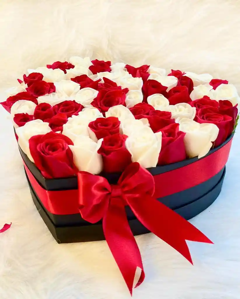 Corazón Majestuoso Bicolor 🌹 Impresionante arreglo en forma de corazón que combina 50 rosas rojas y blancas premium, creando un espectáculo visual que simboliza el amor puro y la pasión. Un regalo extraordinario que cautivará a primera vista. Incluye: 25 rosas rojas premium 25 rosas blancas premium Diseño en forma de corazón Base decorativa elegante Envoltura de lujo con celofán cristal Moño de satín Tarjeta para mensaje personalizado Medidas aproximadas: 40 cm x 40 cm Duración estimada: 7-10 días con cuidados apropiados Ideal para: Bodas, aniversarios, declaraciones de amor o momentos únicos Nota: La combinación de rosas rojas y blancas simboliza la unión perfecta entre la pasión y la pureza. ¡Un regalo que habla por sí mismo!"