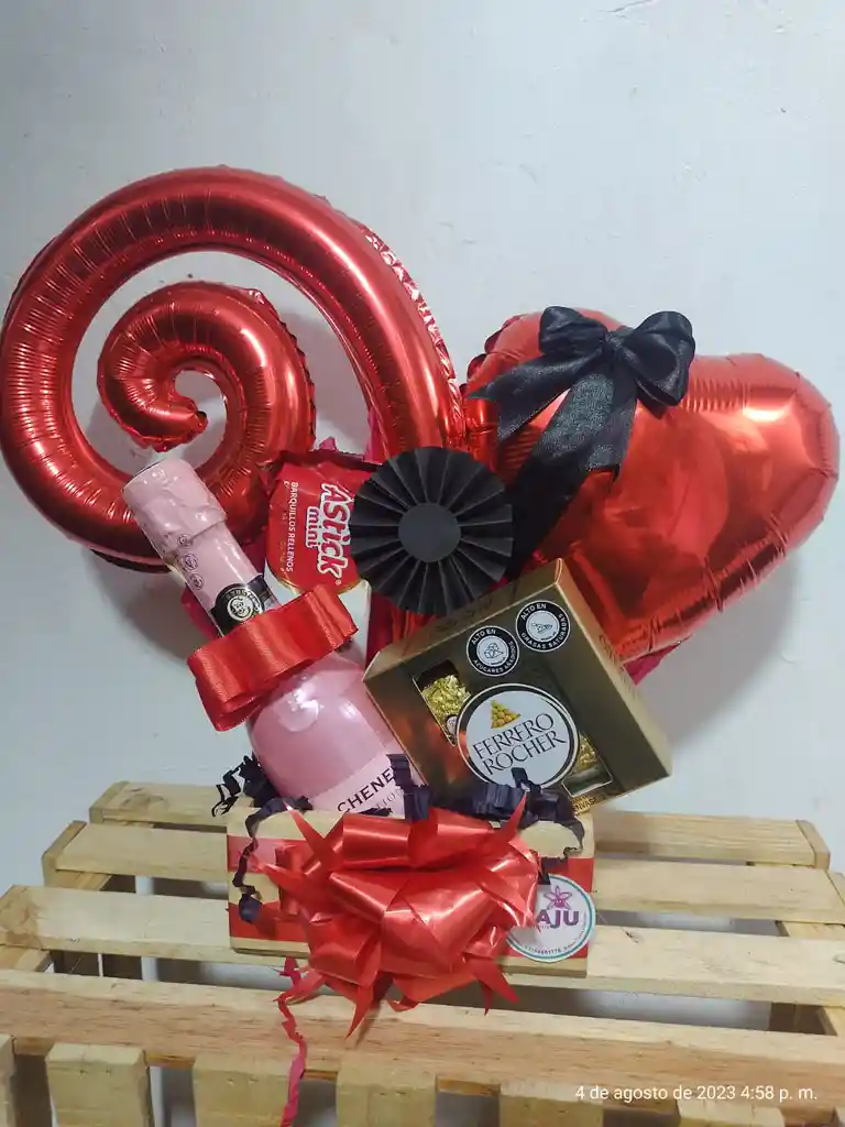 ancheta de amor con vino jp chocolates ferrero barquillos rellenos areglo de globos