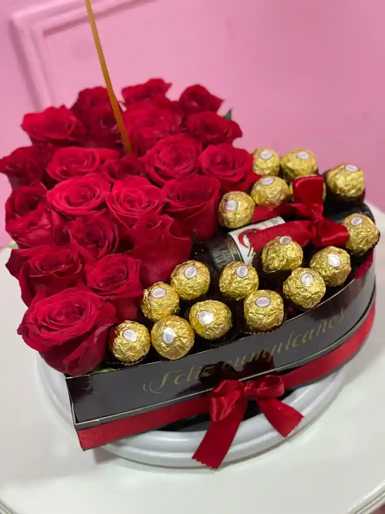 Hermosos corazón con rosas, entre 15-20 chocolates y una botellita de vinitoAutoritas, solicitar colores de rosas y caja disponibles.