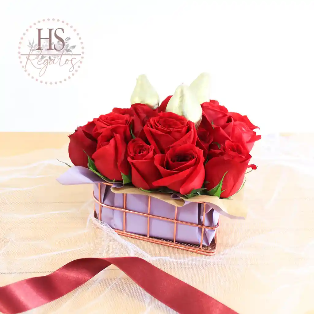 Incluye: · Tarjeta con mensaje personalizado (escribe el mensaje en notas del pedido) – Canasta organizadora en forma de corazón oro rosa – Docenas de rosas rojas – 3 fresas con chocolate doradas – Kit de bienvenida (Sobre con cupón de bienvenida e imán decorativo) – Tela tutu – Moño de cinta de tela