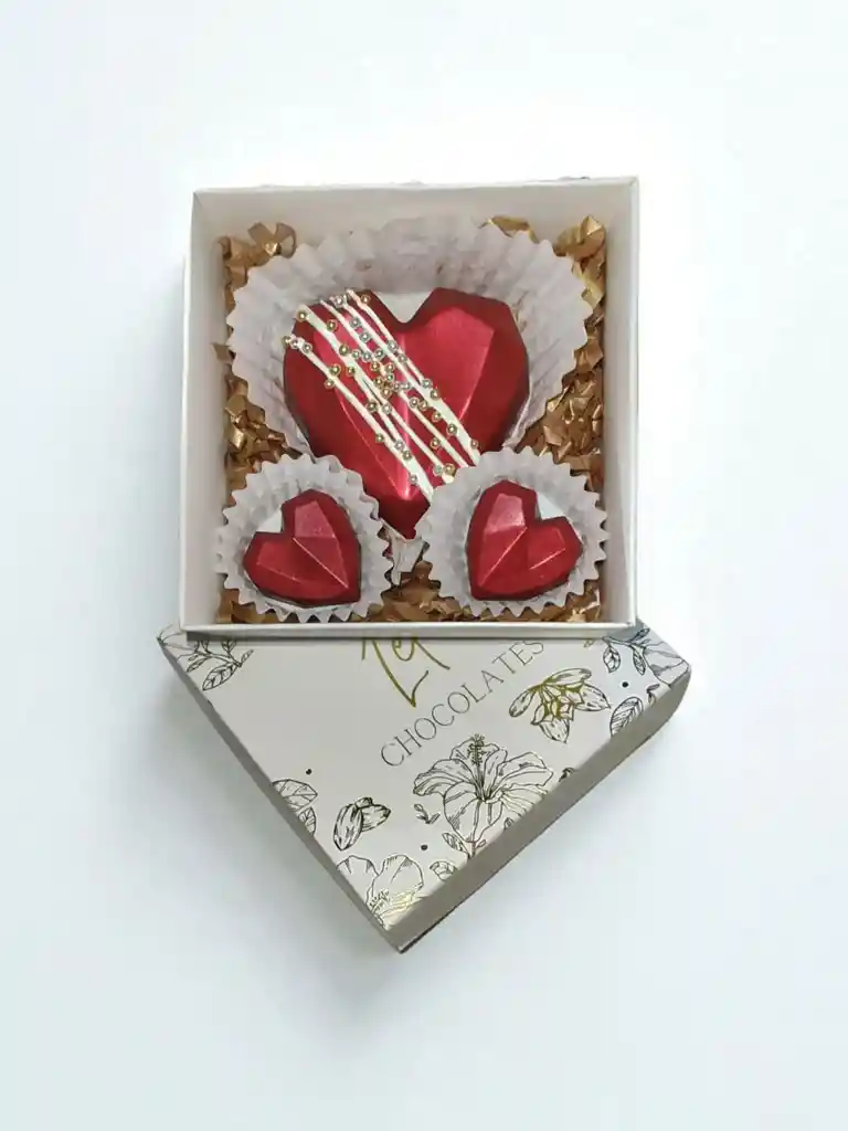 Corazon de chocolate relleno de frutos rojos y Brownie de Chocolate. Presentado en hermosa caja de regalo y moño en cinta tela. Corazón 6.5cms * 5.5cms / caja 10*10cms