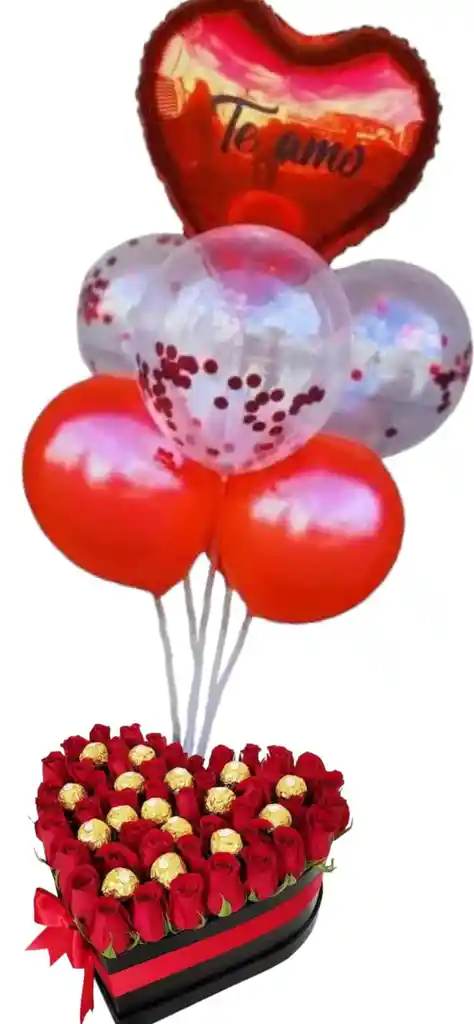 Caja de lujo en forma de corazón, 40 rosas rojas, follaje, y 16 chocolates ferrero, 6 bombas con Helio.