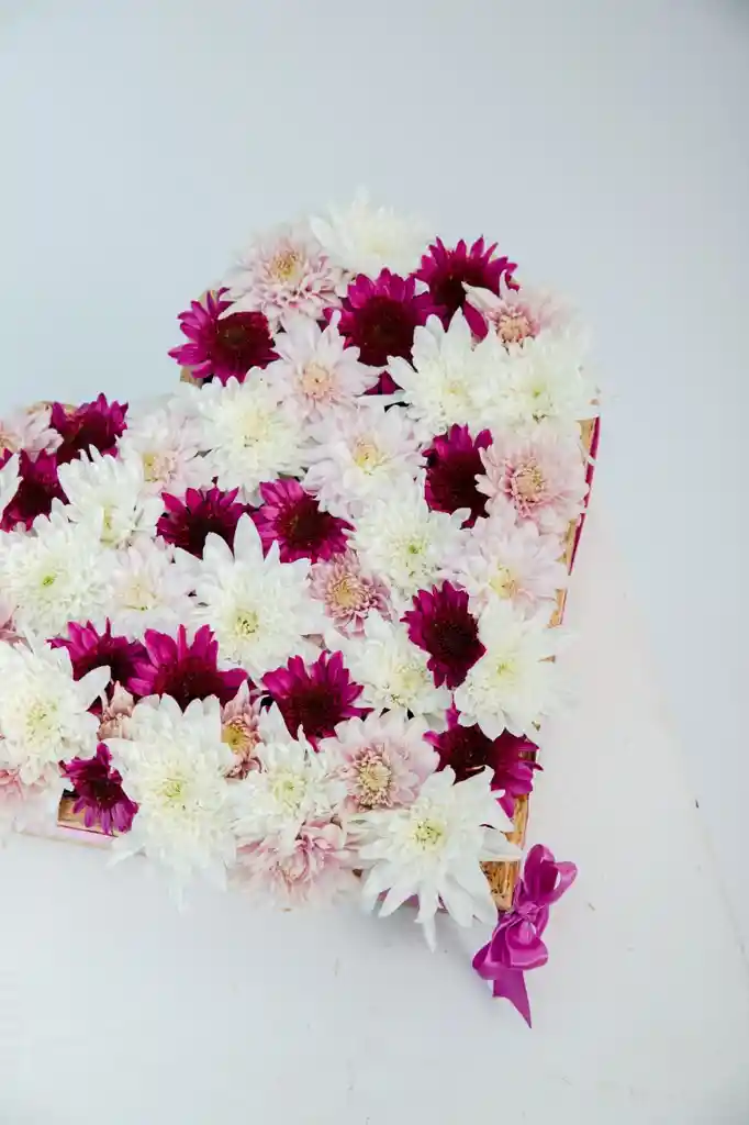 Lindo corazón de madera, decorado con frescas Margaritas en tonos blancos y lilas; para un gran amor. CONTIENE: Caja de corazón Tarjeta Globo en helio de corazón.