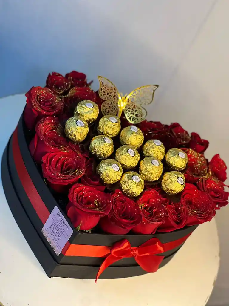 Hermoso corazón de rosas en caja de lujo con 36 rosas premium y tarjeta personalizada.