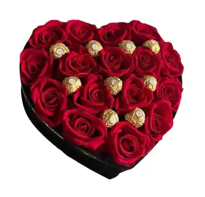 Elegante arreglo floral en forma de corazón, elaborado con rosas rojas frescas de alta calidad y delicadamente acompañado con chocolates Ferrero Rocher, creando una combinación perfecta entre romance, lujo y dulzura. Presentado en una caja tipo corazón de acabado sofisticado, este diseño es ideal para sorprender y conquistar con un detalle inolvidable. Incluye tarjeta personalizada sin costo, para que expreses tu mensaje de amor de manera especial. Perfecto para San Valentín, aniversarios, cumpleaños, celebraciones románticas o momentos que merecen un detalle único.