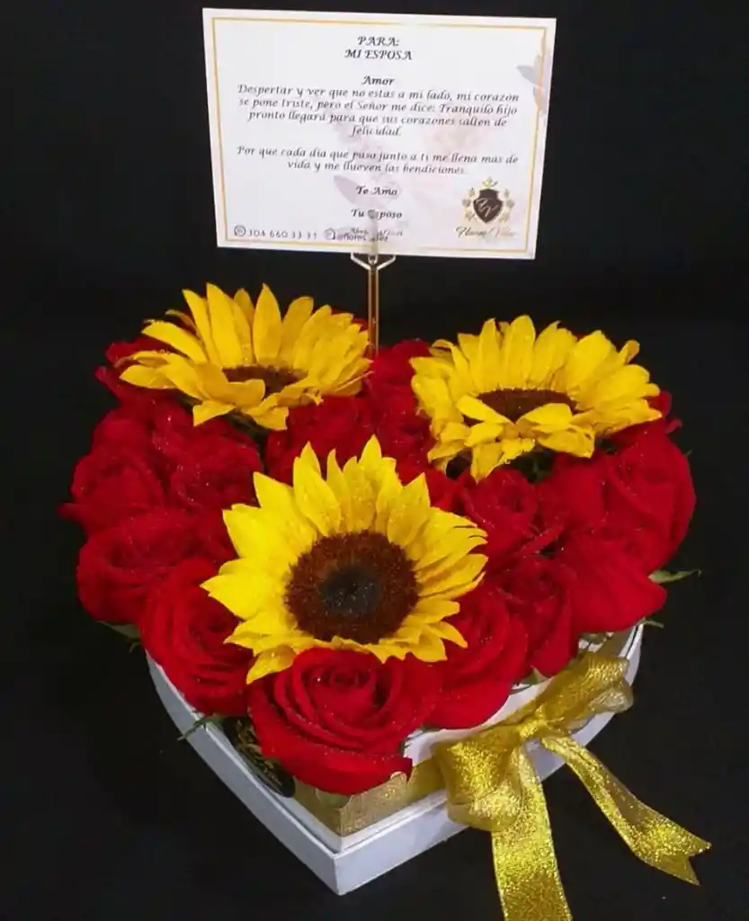Corazón de Rosas Rojas y 3 Girasoles, incluye tarjeta personalizada color Vinotinto ideal para el Amor